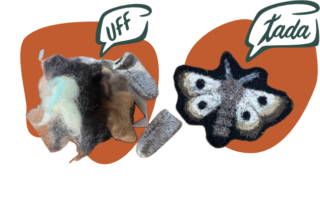 Step 3: When you are finished with your design, choose an attachment method to adhere it over the moth hole. Methods can include felting directly onto the article of clothing, following the directions on double-sided iron-on backing, stitching with a needle and thread, or even a combination of all three!
