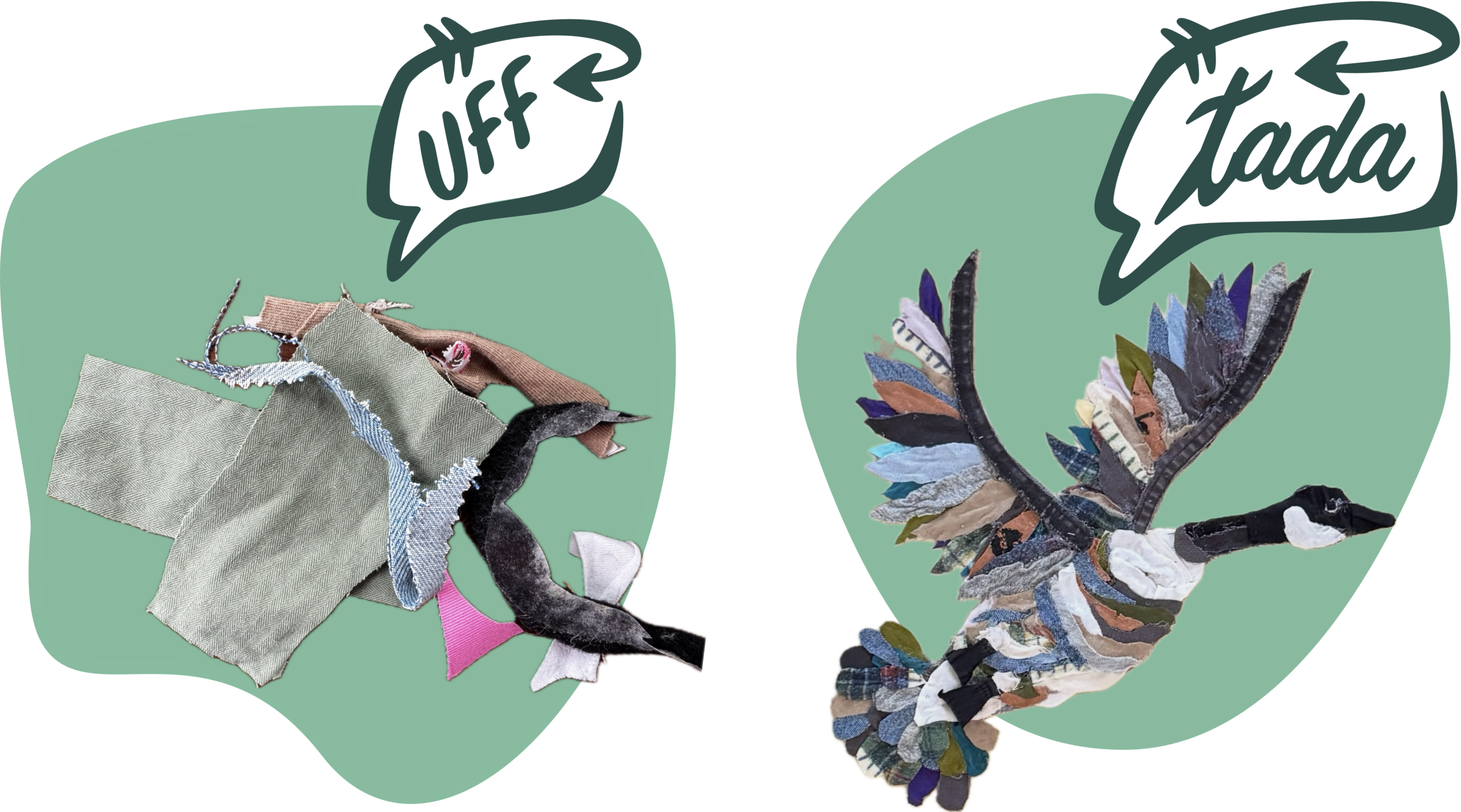 At Uff Tada, we try to create as little waste as possible. Everything has potential. The scraps that are created by trimming patches? Those get slowly collected and turned into art, such as scrap-fabric mosaics. Have trimmings of your own? Give it a try and show us what your tattered scraps inspire you to create.